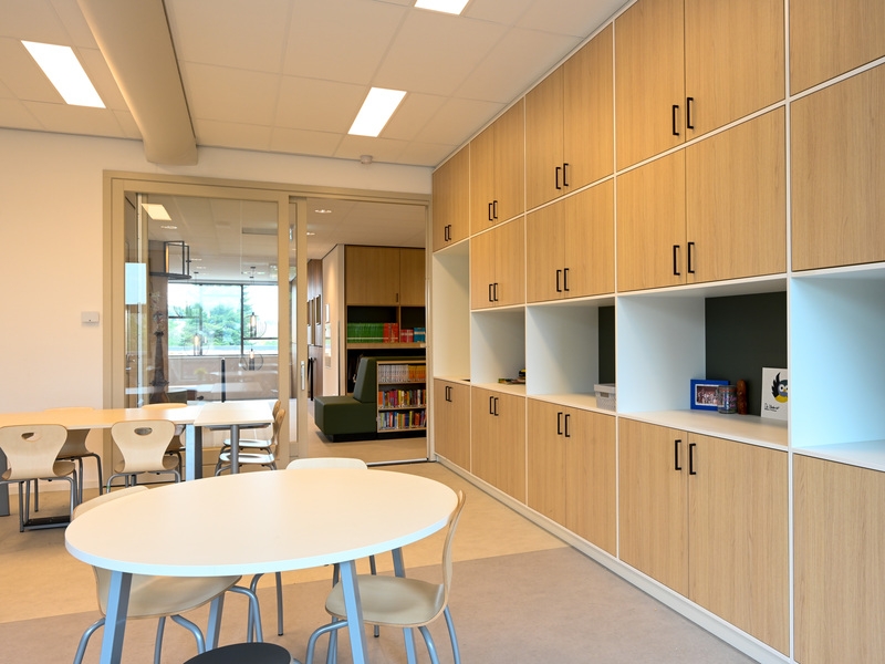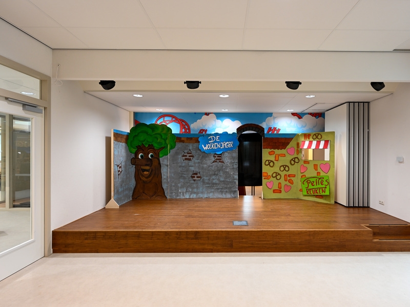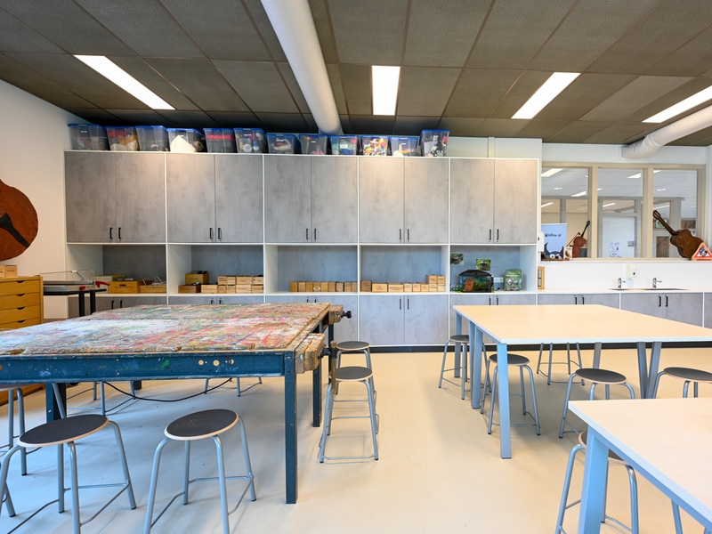 Een gebouw dat rust uitstraalt zodat al onze kunst extra mooi zichtbaar is. Waarin het podium, met prachtige tribunetrap een centrale plek heeft. Waar zelfs een handvaardigheid/techniek lokaal is. En waar op de leerpleinen iedereen elkaar kan vinden om van en met elkaar te leren.
